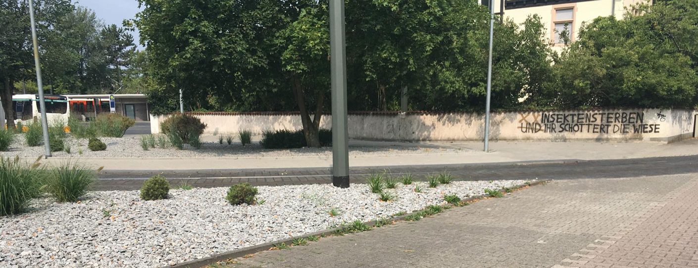 Von der verunkrauteten Schotterwüste zur artenreichen Wildpflanzenfläche: Hier hat sich seit 2019 wirklich viel getan. Nach der Neuanlage als Magerstandort und der Pflanzung von vorwiegend heimischen Wildstauden, Wildsträuchern und naturnahen Rosen, haben sich die Flächen an der Straßenbahn-Wendeschleife am Böllenfalltor in ein buntes, artenreiches Trittsteinbiotop für Insekten in Darmstadt entwickelt.